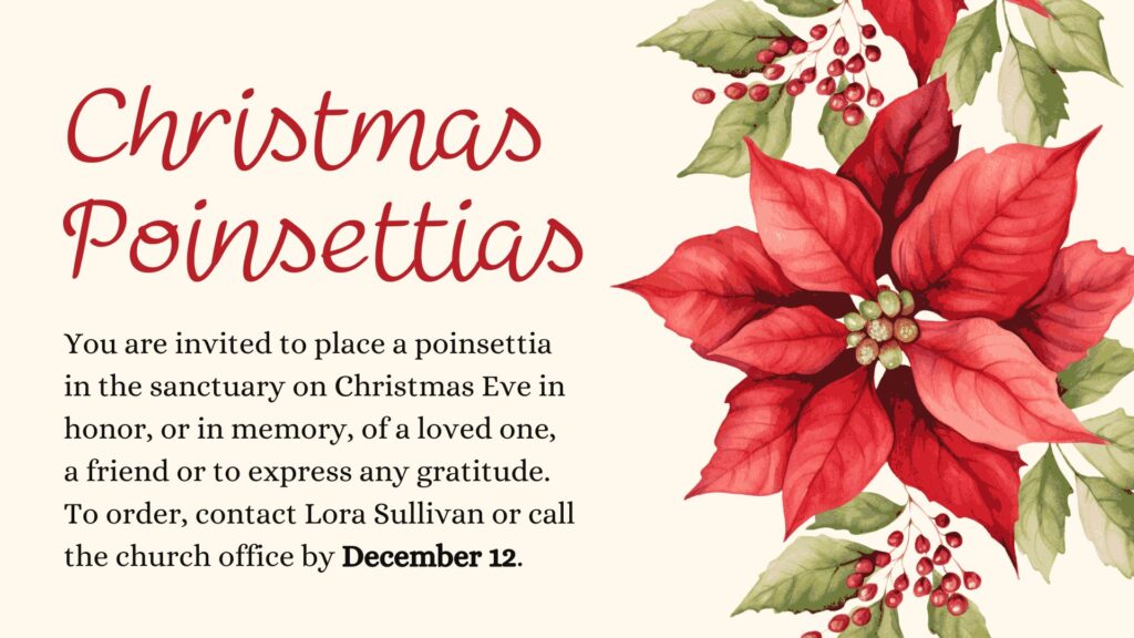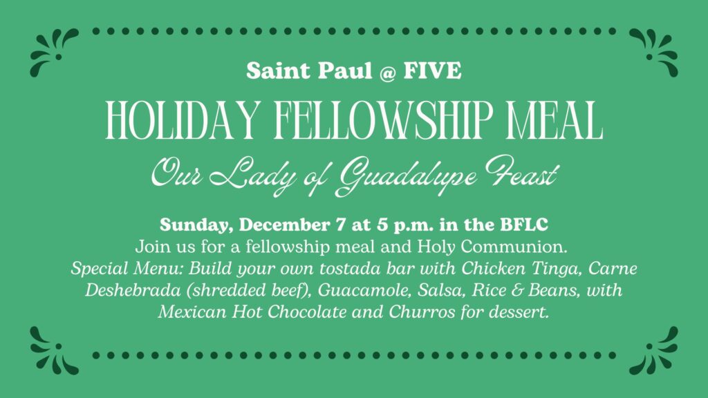 We will celebrate Christmas Eve at 5:00 p.m. and 7:00 p.m. This worship experience is for the whole family and includes traditional carols led by the Saint Paul Choir and guest musicians. Both services conclude with “Silent Night” by candlelight.